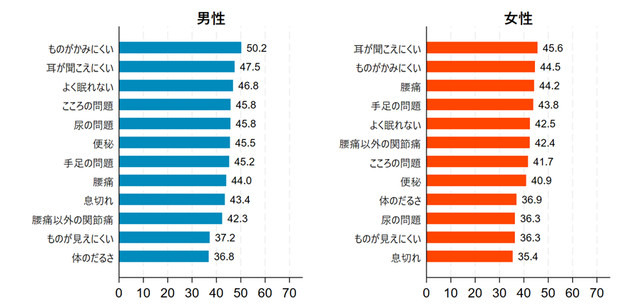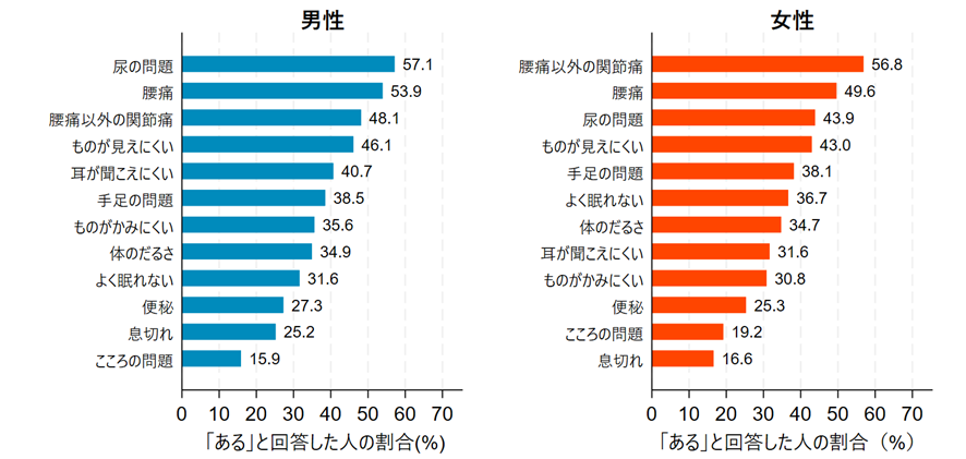 住民の方々に「健康上のお困り事」について伺いました。 「尿の問題」「腰痛」「腰痛以外の関節痛」が頻度の高い上位3項目でした。12項目のうち9項目では、3割以上の方が何らかのお困りごとを抱えており、全体として頻度が高いことが明らかになりました(図1)。
