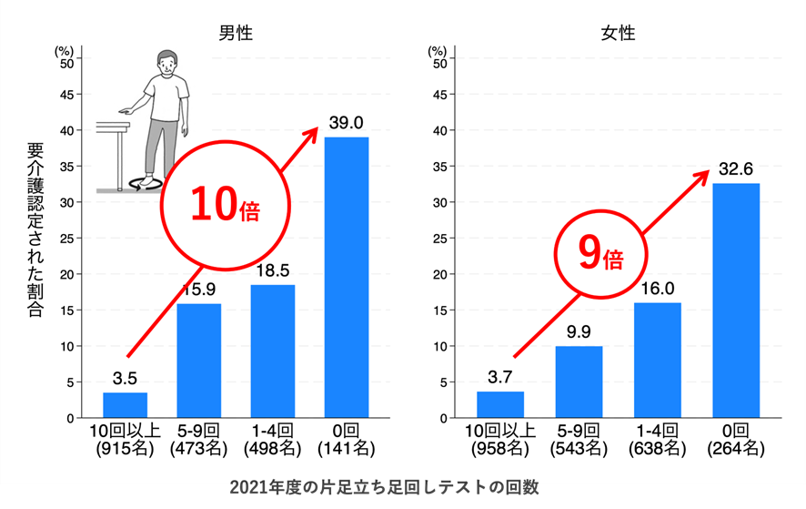 例えば、片足立ちで足を回す運動ができる回数が減るごとに要介護認定の割合が大きく上昇していました。他の運動でも同様の結果が確認されています。ご自身で簡単にできる運動テストによって将来の要介護リスクを知ることができることが分かりました。リスクの高い方々が、どのような運動をすれば良いかなどについて、今後LINEで配信していく予定です。