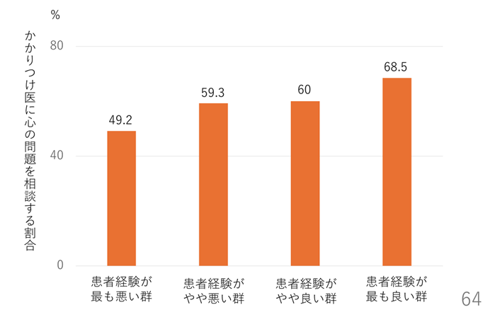 その結果、患者経験が良いと感じている人ほど、心の問題があるときに、かかりつけ医療機関の先生方やスタッフに相談している割合が高い傾向がみられました。気分の落ち込みや不安などの心の悩みは、誰にとっても相談しにくいものですが、日頃の診療を通じて「相談しやすい」と感じられていることが、実際の相談行動につながっている可能性が考えられます。かかりつけ医を持たれていないご高齢の方々は、ごご検討してみてはいかがでしょうか? 今後は、かかりつけ医の先生方ともこのような結果を共有し、地域全体でよりよい医療につなげていきたいと考えています。